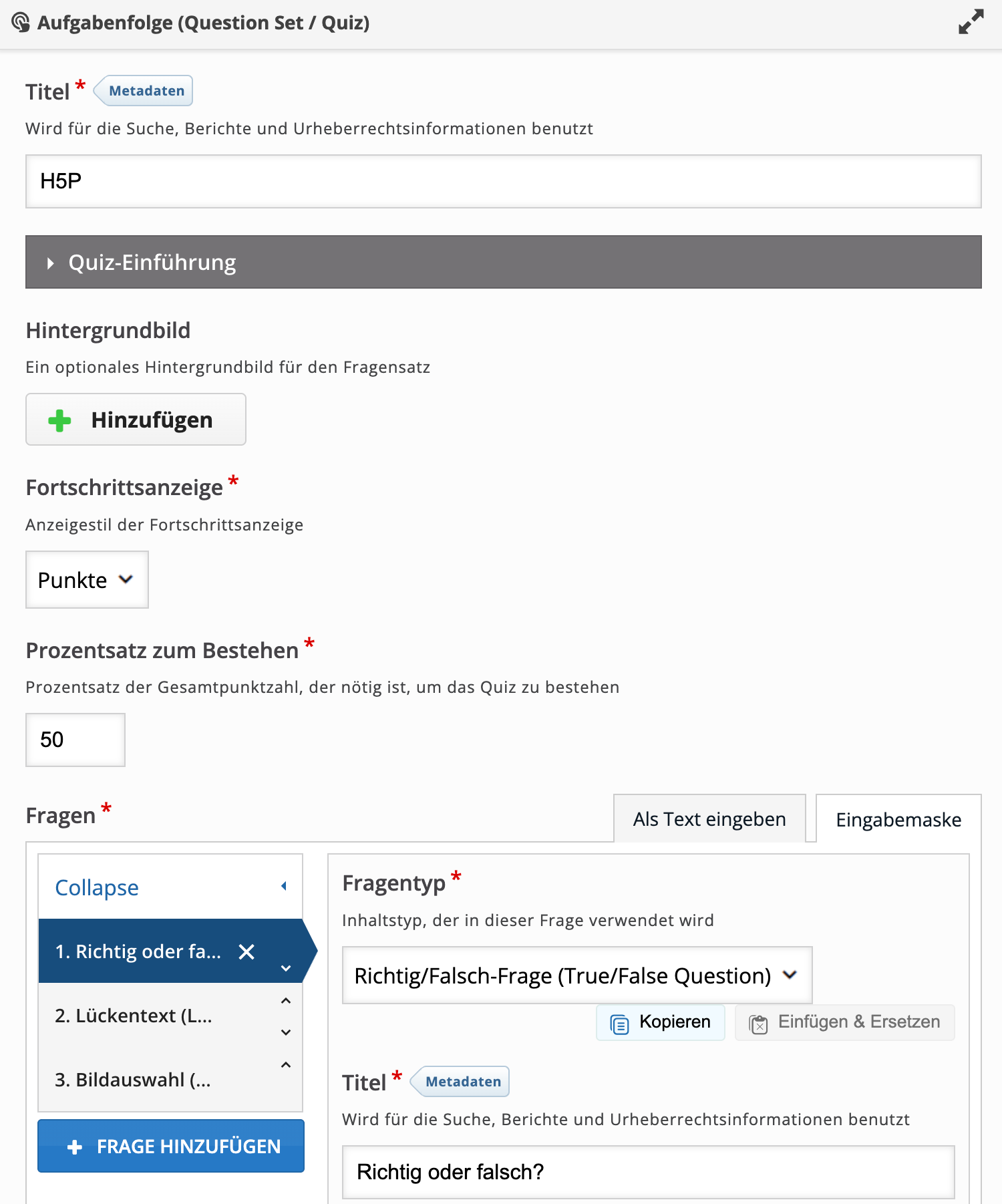 Mit dem Open Source-Tool H5P (das bedeutet: HTML5 Package) können ohne Programmierkenntnisse einigermaßen intuitiv auch komplexe interaktive Lehr-Lern-Inhalte erstellt und gestaltet werden. Die Inhaltstypen sind vielfältig und nutzen den Gamification-Faktor: Kleine Spiele können mit H5P besonders einfach erstellt und für das Lernen genutzt werden. Eine Auswertung bzw. Rückmeldung wird in die Inhalte integriert. So eignen sich H5P-Inhalte ganz besonders für das selbstgesteuerte Lernen, da Unterrichtsinhalte individuell vertieft und wiederholt werden können. Zudem können über den "Selbsteinschätzungsbogen" die Ergebnisse aus den Aufgaben einfach gespeichert werden. Grundsätzlich können auch Lernende selbst Lerninhalte mit H5P erstellen und so ihr Verständnis auf kreative Weise vertiefen, im Sinne des "Lernen durch Lehren".