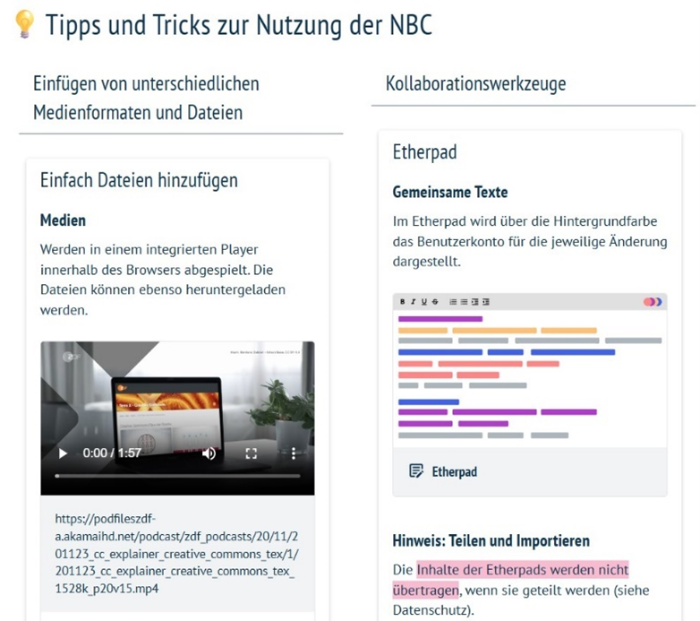 Die NBC bietet auch einfach bedienbare Werkzeuge für die Zusammenarbeit, sowohl textbasiert als auch grafisch. Beide zentralen Elemente (Etherpad und Whiteboard) sind ebenso wie andere Inhalte über den Editor einfügbar.