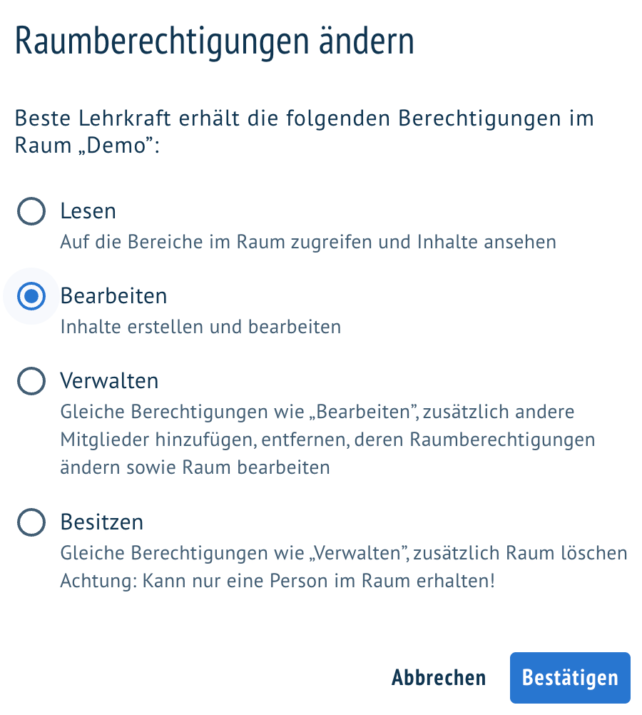 Lernbegleitungen wie Lernende können Räumen hinzugefügt werden, aber es ist möglich, abgestufte Berechtigungen zu vergeben:
